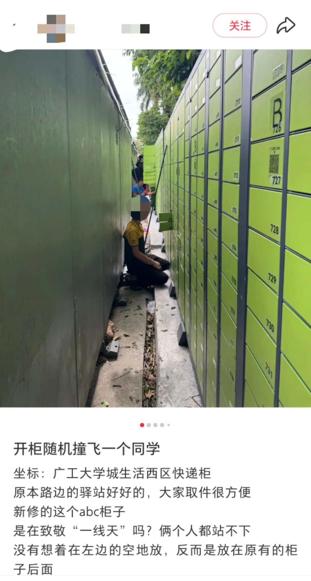 “开柜随机打飞一位同学”,高校两排快递柜间距过窄遭吐槽:初极狭,才通人